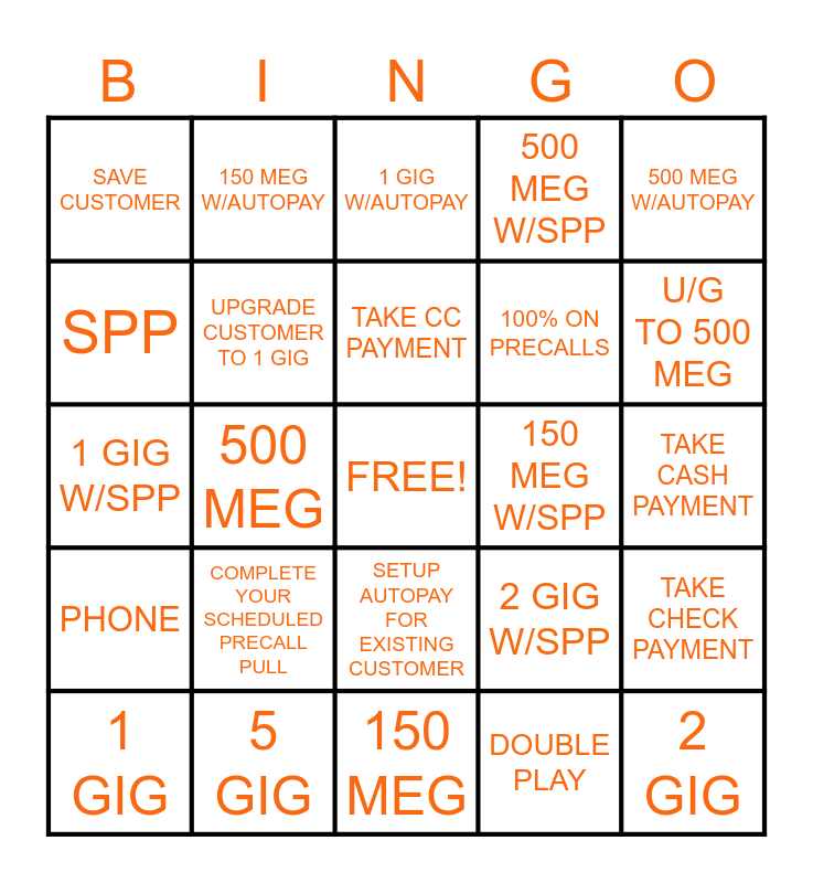 This bingo card has a free space and 24 words: COMPLETE YOUR SCHEDULED PRECALL PULL, 5 GIG, TAKE CC PAYMENT, 1 GIG, 500 MEG W/AUTOPAY, SAVE CUSTOMER, SPP, 150 MEG W/AUTOPAY, 150 MEG W/SPP, SETUP AUTOPAY FOR EXISTING CUSTOMER, 100% ON PRECALLS, 1 GIG W/SPP, 2 GIG W/SPP, TAKE CHECK PAYMENT, UPGRADE CUSTOMER TO 1 GIG, DOUBLE PLAY, TAKE CASH PAYMENT, 1 GIG W/AUTOPAY, U/G TO 500 MEG, 500 MEG, 2 GIG, PHONE, 500 MEG W/SPP and 150 MEG.