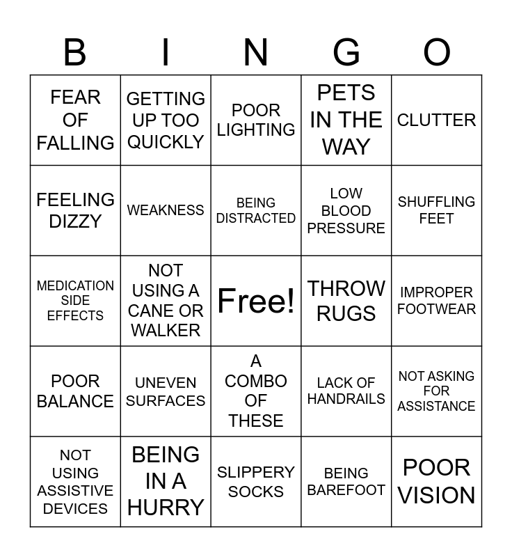 This bingo card has a free space and 26 words: A COMBO OF THESE, BEING BAREFOOT, BEING DISTRACTED, BEING IN A HURRY, CLUTTER, FEAR OF FALLING, FEELING DIZZY, GETTING UP TOO QUICKLY, IMPROPER FOOTWEAR, LACK OF HANDRAILS, LOW BLOOD PRESSURE, MEDICATION SIDE EFFECTS, NOT ASKING FOR ASSISTANCE, NOT USING ASSISTIVE DEVICES, NOT USING A CANE OR WALKER, NUMBNESS IN FEET, PETS IN THE WAY, POOR BALANCE, POOR LIGHTING, POOR VISION, SHUFFLING FEET, SLIPPERY SOCKS, THROW RUGS, UNEVEN SURFACES, WEAKNESS and WET FLOORS.