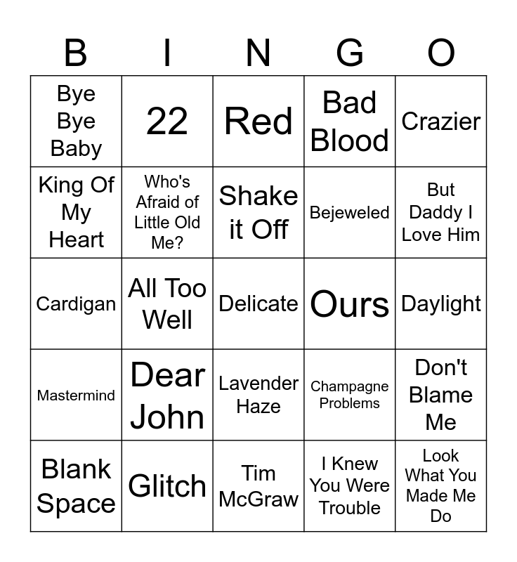 This bingo card has 72 words: Free!, 22, All Too Well, All You Had To Do Was Stay, Anti-Hero, August, Bad Blood, Begin Again, Bejeweled, Betty, Blank Space, Breathless, But Daddy I Love Him, Bye Bye Baby, Call It What You Want, Cardigan, Champagne Problems, Crazier, Cruel Summer, Daylight, Dear John, Delicate, Don't Blame Me, Down Bad, Enchanted, End Game, Everything Has Changed, Fearless, Fifteen, Fortnight, Glitch, Happiness, I Can Do it With a Broken Heart, I Can Fix Him, I Knew You Were Trouble, Illicit Affairs, Invisible String, Karma, King Of My Heart, Last Kiss, Lavender Haze, Look What You Made Me Do, Love Story, Lover, Marjorie, Mastermind, Midnight Rain, Mirrorball, Miss Americana & the Heartbreak Prince, Mr. Perfectly Fine, My Tears Ricochet, Never Grow Up, Our Song, Ours, Paper Rings, Ready For It?, Red, Shake it Off, So High School, Sparks Fly, Style, The Man, The Smallest Man Who Ever Lived, Tim McGraw, Vigilante S---, We Are Never Ever Getting Back Together, Who's Afraid of Little Old Me?, Wildest Dreams, Willow, Wonderland, You Belong With Me and You Need to Calm Down.