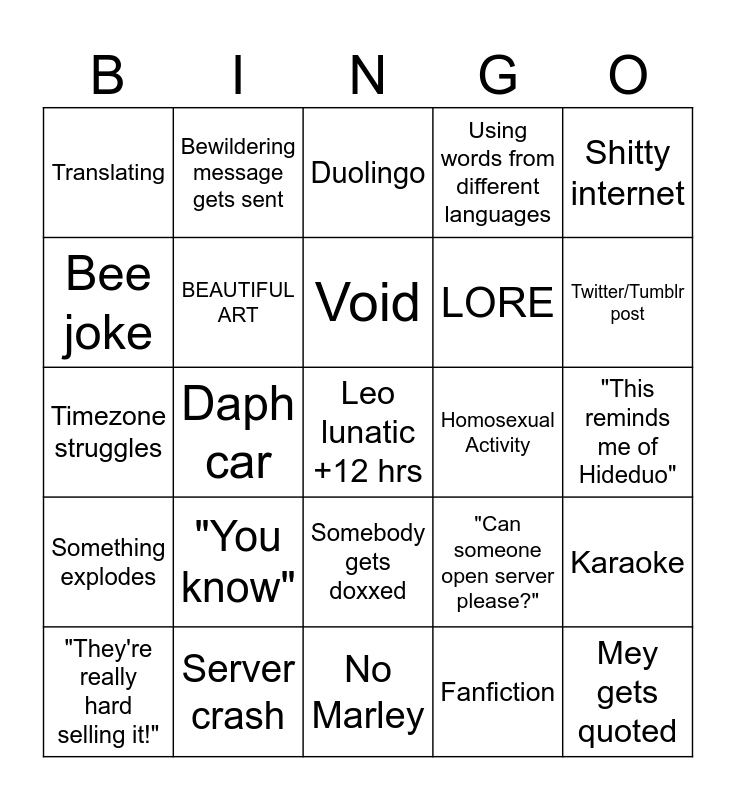 This bingo card has 25 words: "You know", No Marley, Void, "They're really hard selling it!", Shitty internet, Translating, Bee joke, Bewildering message gets sent, Homosexual Activity, Somebody gets doxxed, LORE, Timezone struggles, "Can someone open server please?", Karaoke, BEAUTIFUL ART, Mey gets quoted, "This reminds me of Hideduo", Duolingo, Twitter/Tumblr post, Daph car, Leo lunatic +12 hrs, Server crash, Something explodes, Using words from different languages and Fanfiction.