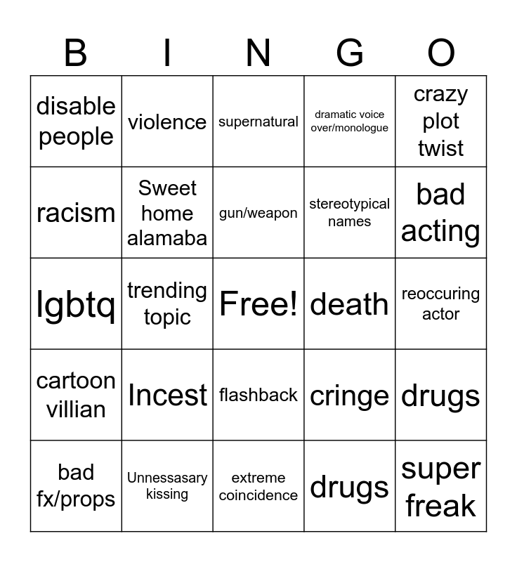 This bingo card has a free space and 24 words: Incest, Unnessasary kissing, gun/weapon, bad fx/props, crazy plot twist, disable people, racism, violence, death, flashback, stereotypical names, lgbtq, cringe, drugs, Sweet home alamaba, drugs, reoccuring actor, supernatural, bad acting, trending topic, super freak, cartoon villian, dramatic voice over/monologue and extreme coincidence.