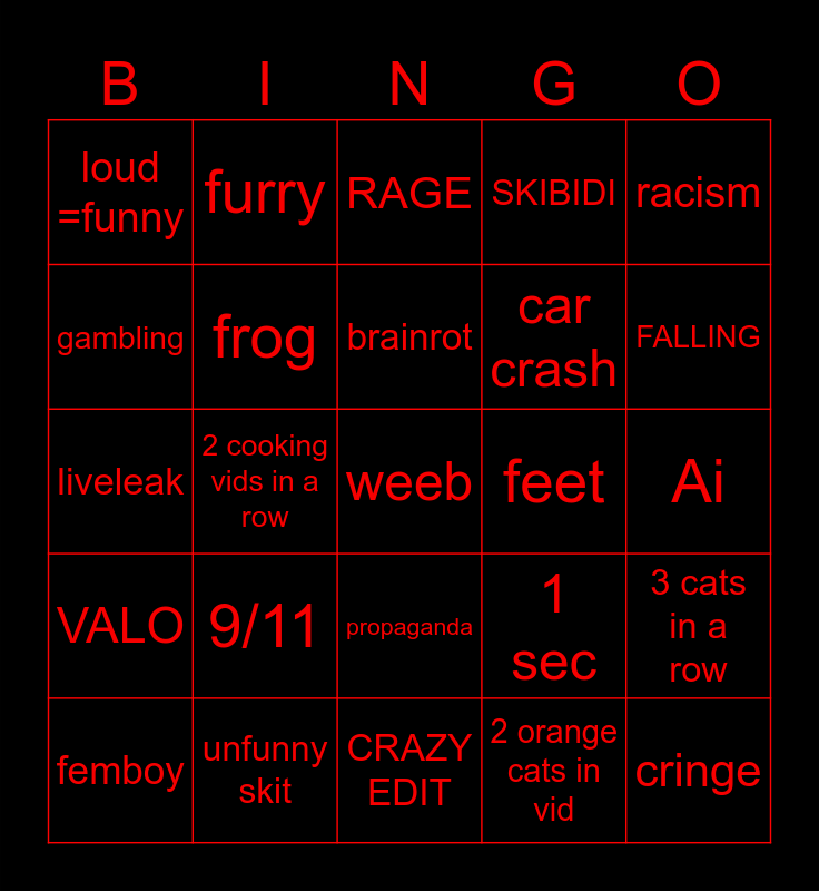 This bingo card has a free space and 24 words: 9/11, unfunny skit, brainrot, femboy, racism, loud =funny, gambling, furry, feet, propaganda, car crash, liveleak, 1 sec, 3 cats in a row, frog, 2 orange cats in vid, Ai, RAGE, FALLING, 2 cooking vids in a row, cringe, VALO, SKIBIDI and CRAZY EDIT.