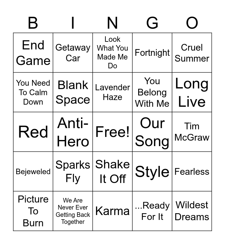 This bingo card has a free space and 32 words: ...Ready For It, 22 All Too Well, Anti-Hero, Illicit Affairs, Bejeweled, Blank Space, Cruel Summer, Fearless, Getaway Car, I Knew You Were Trouble, Lavender Haze, Look What You Made Me Do, Love Story, Mine, Our Song, Out Of The Woods, Picture To Burn, Red, Shake It Off, Sparks Fly, Style, Teardrops On My Guitar, Tim McGraw, We Are Never Ever Getting Back Together, Wildest Dreams, Fortnight, You Belong With Me, You Need To Calm Down, End Game, Karma, Bad Blood and Long Live.