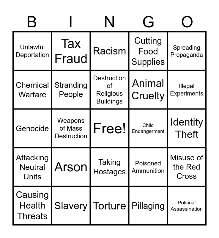 This bingo card has a free space and 24 words: Arson, Slavery, Destruction of Religious Buildings, Causing Health Threats, Spreading Propaganda, Unlawful Deportation, Chemical Warfare, Tax Fraud, Child Endangerment, Taking Hostages, Animal Cruelty, Genocide, Poisoned Ammunition, Misuse of the Red Cross, Stranding People, Pillaging, Identity Theft, Racism, Illegal Experiments, Weapons of Mass Destruction, Political Assassination, Attacking Neutral Units, Cutting Food Supplies and Torture.