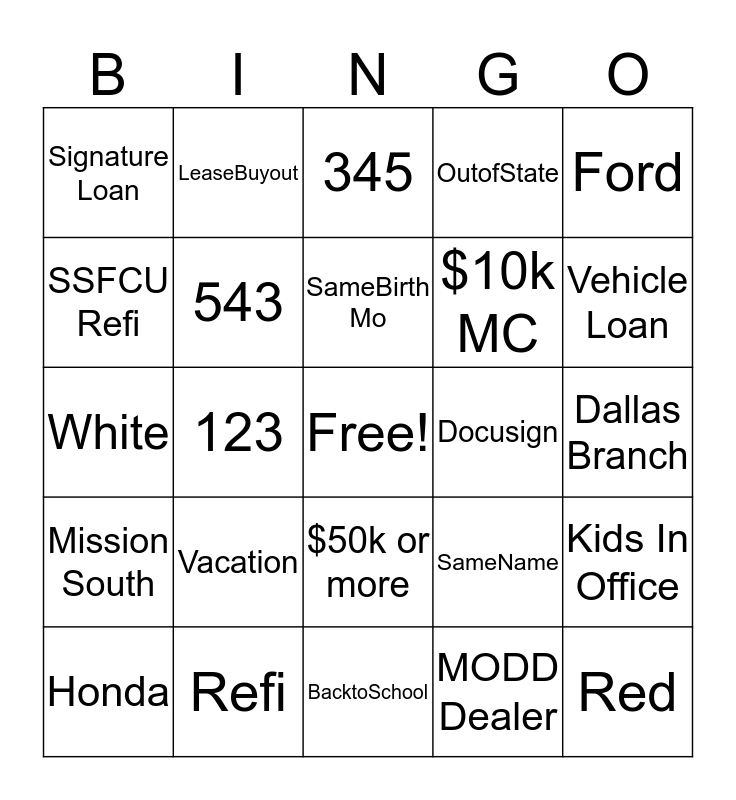 This bingo card has a free space and 44 words: MMP, Red, VBCIssue, Honda, $20kMC, MODD Dealer, 345, GAP Advantage, Ford, Refi, OutofState, Docusign, $50k or more, Vacation, Live Oak, BacktoSchool, Blue, White, Floresville, Vehicle Loan, LeaseBuyout, UPSGround, Bandera Pointe, Signature Loan, VBCFin, Dallas Branch, Austin Branch, Potranco, SameName, Mission South, 765, Kids In Office, Black, Gold Canyon, 123, Dealer Purchase, Buyer Seller, 789, SameBirth Mo, SSFCU Refi, $10k MC, Dlr Review, 543 and PPI.