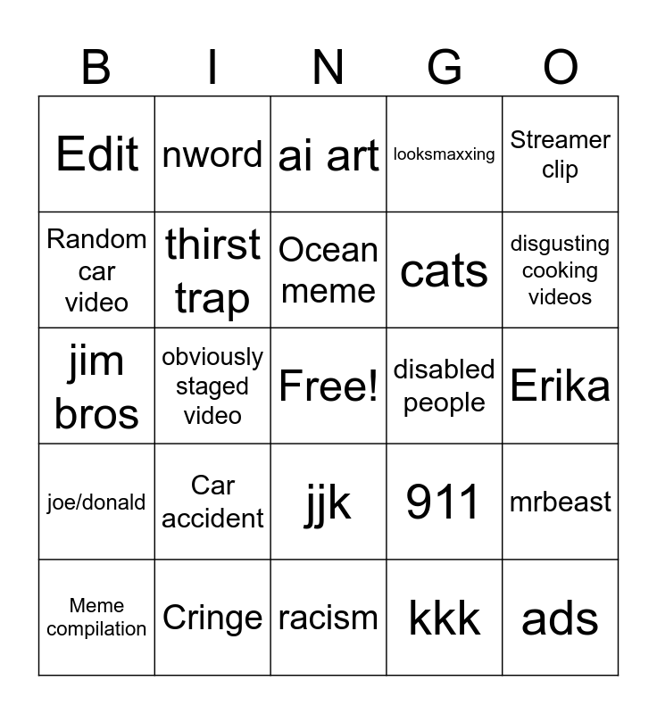 This bingo card has a free space and 24 words: Car accident, Cringe, Ocean meme, Meme compilation, Streamer clip, Edit, Random car video, nword, disabled people, jjk, cats, jim bros, 911, mrbeast, thirst trap, kkk, Erika, ai art, disgusting cooking videos, obviously staged video, ads, joe/donald, looksmaxxing and racism.