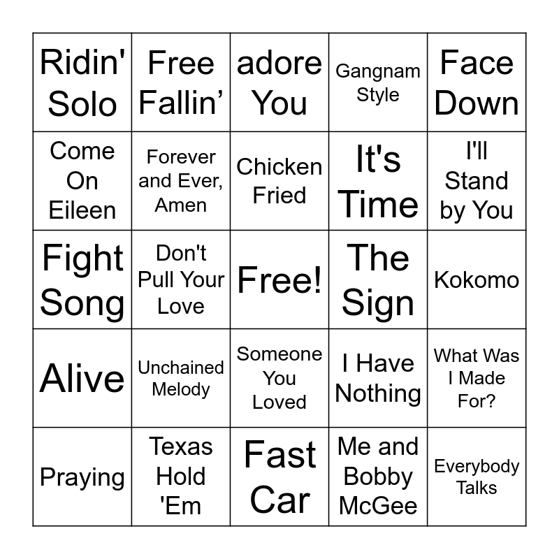 This bingo card has a free space and 75 words: 1985, A Moment Like This, adore You, All About That Bass, All I have to Give, Angel of Mine, Any Man of Mine, Bang a Gong, Barbie Girl, Boot Scootin' Boogie, Bring Me To Life, Castle on the Hill, Chicken Fried, Come On Eileen, Don't Cry Out Loud, Don't Pull Your Love, Eternal Flame, Everybody Talks, Evil Woman, Face Down, Fancy Like, Fight Song, Forever and Ever, Amen, Free Fallin’, Gangnam Style, Gangsta's Paradise, God Bless the USA, Heads Carolina, Tails California, Hemorrhage, Hey Ya!, High Hopes, how do i live, I Guess That’s Why They Call It the Blues, I Have Nothing, I'll Stand by You, It's Time, Jessie’s Girl, Just Like Jesse James, Kokomo, Me and Bobby McGee, Monster Mash, Moonlight Sonota, Never Be the Same, Pachelbel's Canon, Party in the U.S.A., Piano Man, Praying, Ridin' Solo, Rise Up, Sister Christian, Somebody That I Used to Know, Someone You Loved, St. Elmo’s Fire, Stan, Stressed Out, Stupid Love, The Final Countdown, Total Eclipse of the Heart, Two Out of Three Aint Bad, Umbrella, Unchained Melody, Walk Me Home, Welcome to the Black Parade, We're All Alone, Wild Ones, The Sign, Don't Stop Believin', Espresso, Too Sweet, What Was I Made For?, Alive, Texas Hold 'Em, 9 to 5, Fast Car and A Bar Song (Tipsy).