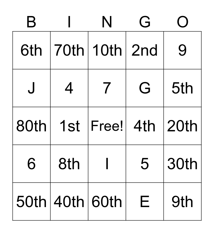 This bingo card has a free space and 36 words: 1, 2, 3, 4, 5, 6, 7, 8, 9, 10, 1st, 2nd, 3rd, 4th, 5th, 6th, 7th, 8th, 9th, 10th, 20th, 30th, 40th, 50th, 60th, 70th, 80th, 90th, G, J, Z, D, E, I, B and P.