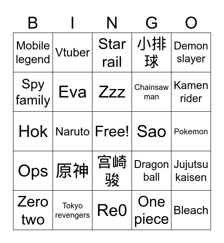 This bingo card has a free space and 24 words: 原神, Tokyo revengers, Zzz, Zero two, Demon slayer, Mobile legend, Spy family, Vtuber, Sao, 宫崎骏, Chainsaw man, Hok, Dragon ball, Jujutsu kaisen, Eva, One piece, Pokemon, Star rail, Kamen rider, Naruto, Bleach, Ops, 小排球 and Re0.