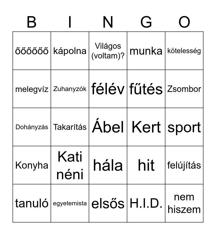This bingo card has a free space and 29 words: tanuló, példás, Takarítás, lakó, őőőőőő, Világos (voltam)?, Zuhanyzók, Kati néni, Kert, egyetemista, sport, nem hiszem, elsős, H.I.D., Zsombor, Intelmek, hála, Konyha, kötelesség, Dohányzás, hit, Érthető (voltam)?, fűtés, melegvíz, munka, kápolna, felújítás, félév and más kollégiumok.