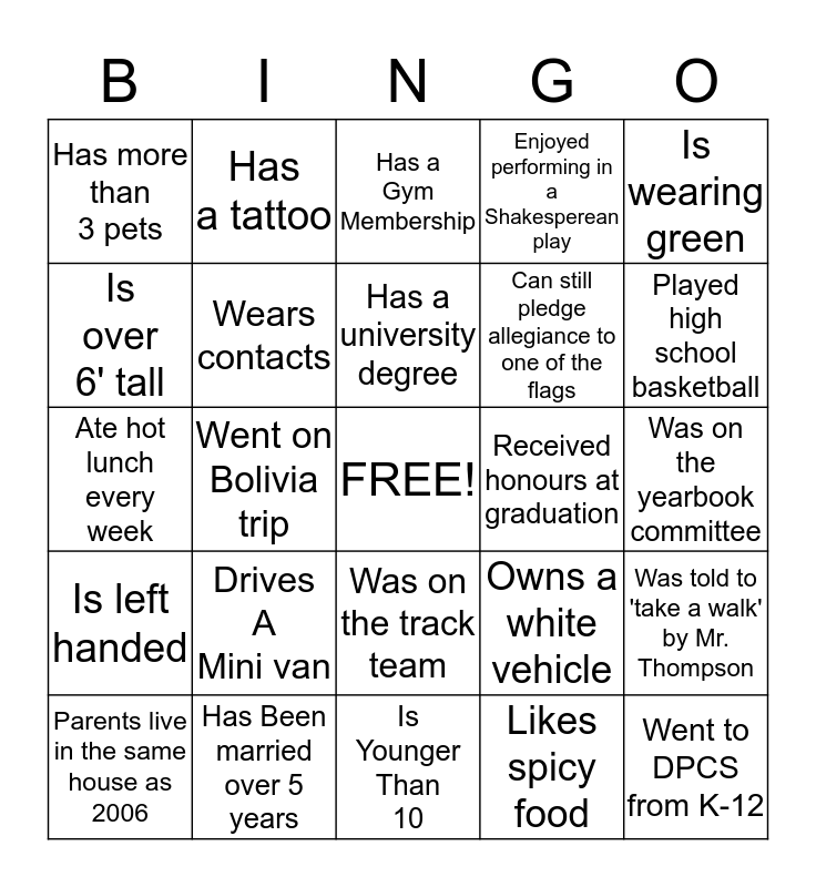 This bingo card has a free space and 24 words: Drives A Mini van, Has Been married over 5 years, Has a university degree, Parents live in the same house as 2006, Is wearing green, Has more than 3 pets, Is over 6' tall, Has a tattoo, Received honours at graduation, Was on the track team, Can still pledge allegiance to one of the flags, Ate hot lunch every week, Owns a white vehicle, Was told to 'take a walk' by Mr. Thompson, Wears contacts, Likes spicy food, Was on the yearbook committee, Has a Gym Membership, Played high school basketball, Went on Bolivia trip, Went to DPCS from K-12, Is left handed, Enjoyed performing in a Shakesperean play and Is Younger Than 10.
