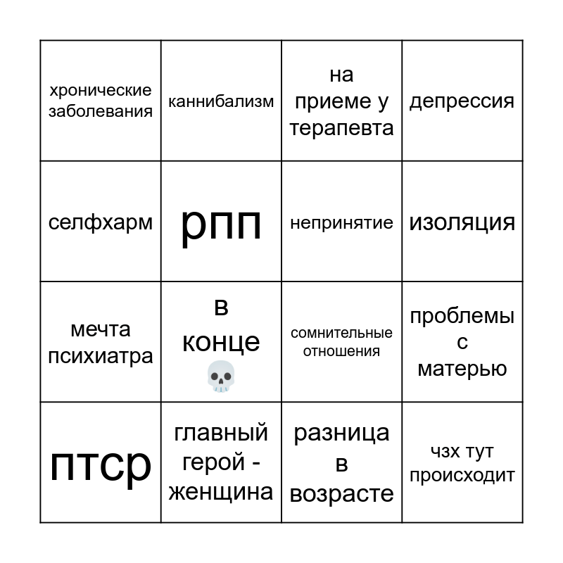 This bingo card has 16 words: главный герой - женщина, проблемы с матерью, на приеме у терапевта, хронические заболевания, мечта психиатра, каннибализм, сомнительные отношения, разница в возрасте, селфхарм, рпп, птср, депрессия, в конце 💀, изоляция, непринятие and чзх тут происходит.