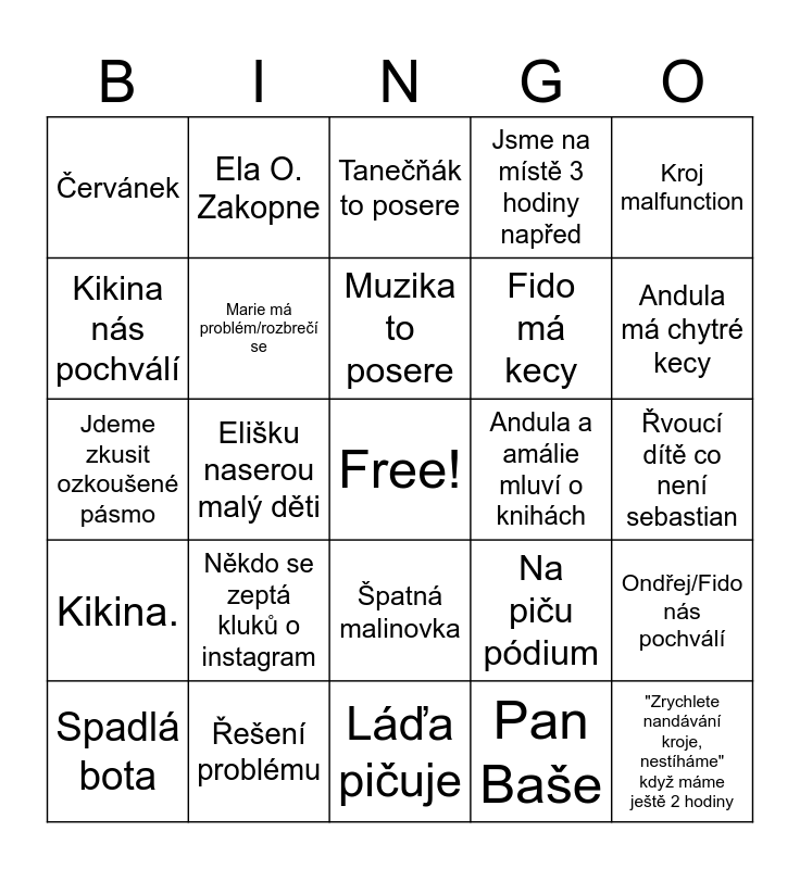 This bingo card has a free space and 34 words: Kikina pičuje, Pan Baše, Sebastian pičuje, Sebastian., Kikina., Marie má problém/rozbrečí se, Kroj malfunction, Spadlá bota, Ela O. Zakopne, Kroj malfunction by ela o, Muzika to posere, Tanečňák to posere, Kikina odebere nepotřebně tanec, Kikina přidá malé do tance pro velké, Andula a amálie mluví o knihách, Andula má chytré kecy, Řešení problému, Jdeme zkusit ozkoušené pásmo, Někdo se zeptá kluků o instagram, Na piču pódium, Špatná malinovka, Pardubický soubor, Červánek, Řvoucí dítě co není sebastian, Láďa pičuje, "Zrychlete nandávání kroje, nestíháme" když máme ještě 2 hodiny, Jsme na místě 3 hodiny napřed, Nemaj spirály :(, Fido má kecy, Kikina nás pochválí, Kikina svádí všechny problémy jen na nás, Elišku naserou malý děti, Ondřej/Fido nás pochválí and Rodiče se bezdůvodně chichotaj.