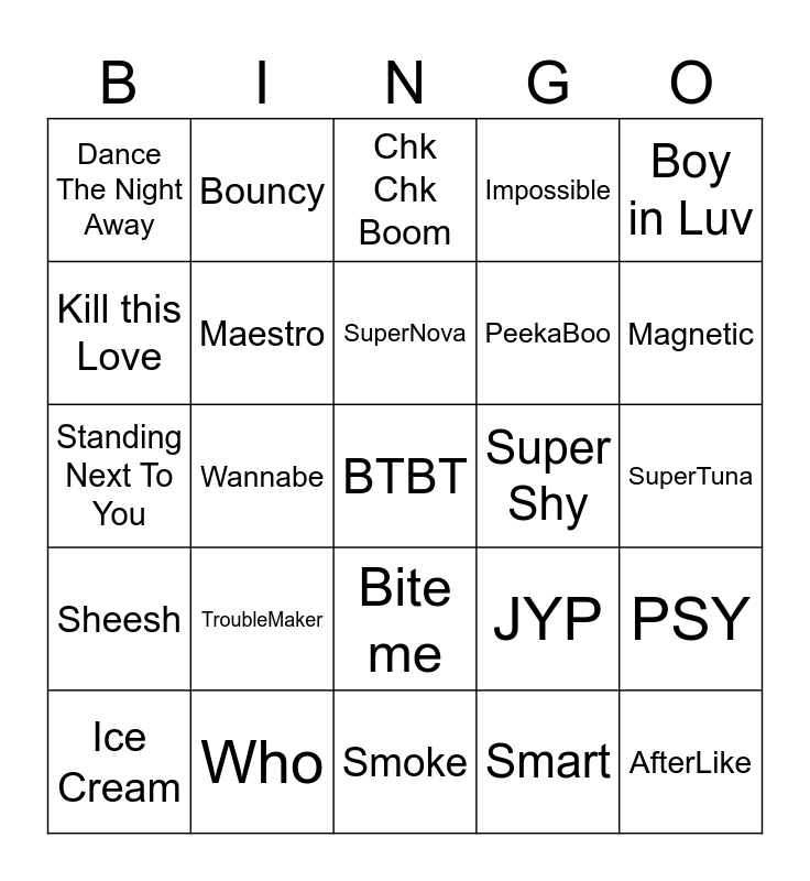This bingo card has a free space and 24 words: Ice Cream, TroubleMaker, SuperNova, Smart, Boy in Luv, Dance The Night Away, Bouncy, Chk Chk Boom, Super Shy, SuperTuna, Standing Next To You, Maestro, JYP, PSY, Kill this Love, Who, Smoke, Impossible, Magnetic, Sheesh, Wannabe, Bite me, PeekaBoo and AfterLike.