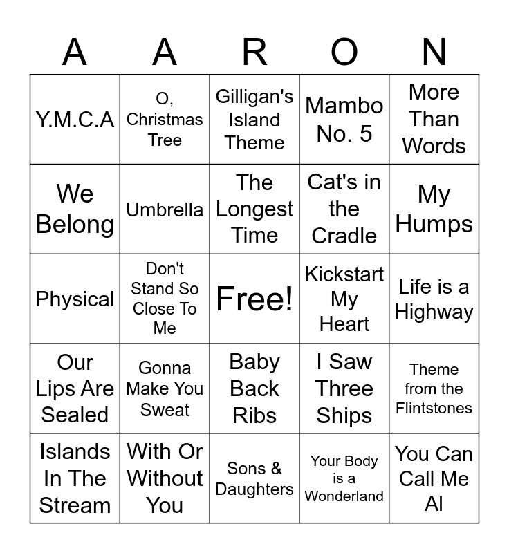 This bingo card has a free space and 116 words: The Office (Main Theme), The Little Drummer Boy, Celebration, Bugler's Dream and Olympic Fanfare, Sweet Georgia Brown, Star Trek Main Theme, Mambo No. 5, O.P.P, You Sexy Thing, Tiny Dancer, (I've Had) The Time of my Life, Drop it like it's Hot, The Star Spangled Banner, Everybody Hurts, We didn't start the Fire, Bang the Drum all day, Baby Back Ribs, Sing, Here I Go Again, I Will Survive, Islands In The Stream, Gilligan's Island Theme, Drunken Sailor, Just the Two of Us, Smoke on the Water, Our Lips Are Sealed, With Or Without You, Get Ready for This, Greensleeves, Teach Your Children, My Humps, The Longest Time, Don't Stand So Close To Me, Unwritten, On The Wings Of Love, Lovefool, Mere Mehboob Mere Sanam, Closer to Fine, Angel of the Morning, What is Love, Rainbow Connection, Two Tickets To Paradise, Deck The Hall, Goodbye My Lover, Dance of the Sugar Plum Fairy, You Oughta Know, Your Body is a Wonderland, We Belong, Spinnin' N Reelin', Lady, Hot Hot Hot, Kickstart My Heart, Rockin' Robin, Zombie, Up Where We Belong, You Were Meant For Me, Hollaback Girl, Drift Away, The Lion Sleeps Tonight, The Gambler, Theme from the Flintstones, Take A Chance On Me, Runaway Train, Chariots Of Fire, Girlfriend, American Pie, Goodbye Stranger, Umbrella, Physical, Son of a Preacher Man, Life is a Highway, Stayin Alive, 1234, Just Dance, Take Me Home, Country Roads, You Can Call Me Al, Gonna Make You Sweat, Y.M.C.A, Push It, Forever, Lullaby, O, Christmas Tree, Boulevard of Broken Dreams, I Saw Three Ships, Cat's in the Cradle, Nobody But Me, I Try, Monster Mash, Ants Marching, Crazy Train, Running On Ice, Seasons Of Love, Kind & Generous, Bring Me To Life, More Than Words, Forever Young, Closing Time, Baby, I Love Your Way, Clocks, Hello! Ma Baby, Signed, Sealed, Delivered (I'm Yours), She's Got A Way, Karma Chameleon, I'll Be, Faith, Girls Just Want To Have Fun, Bad Day, Oh, What A Beautiful Morning, Sons & Daughters, I Will Remember You, Open Your Eyes, Boogie Wonderland, Save a Horse (Ride a Cowboy), Sweet Child O' Mine, Angela and All The Faces.