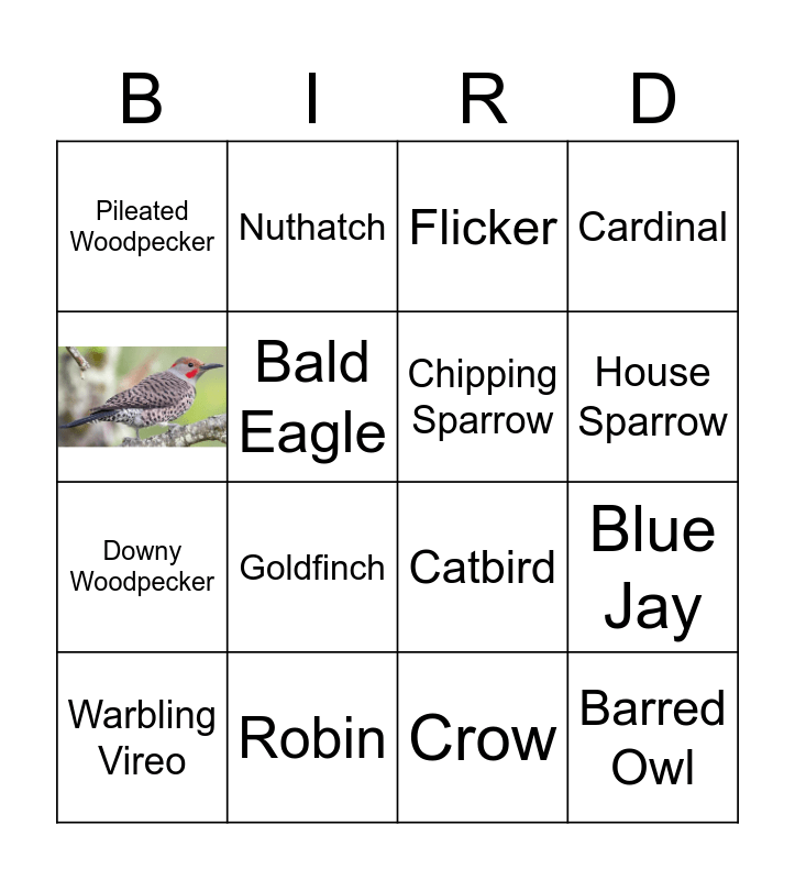 This bingo card has 1 images and 15 words: Robin, Blue Jay, Flicker, Pileated Woodpecker, Downy Woodpecker, Nuthatch, Catbird, Crow, Bald Eagle, Warbling Vireo, Cardinal, Goldfinch, House Sparrow, Chipping Sparrow and Barred Owl.