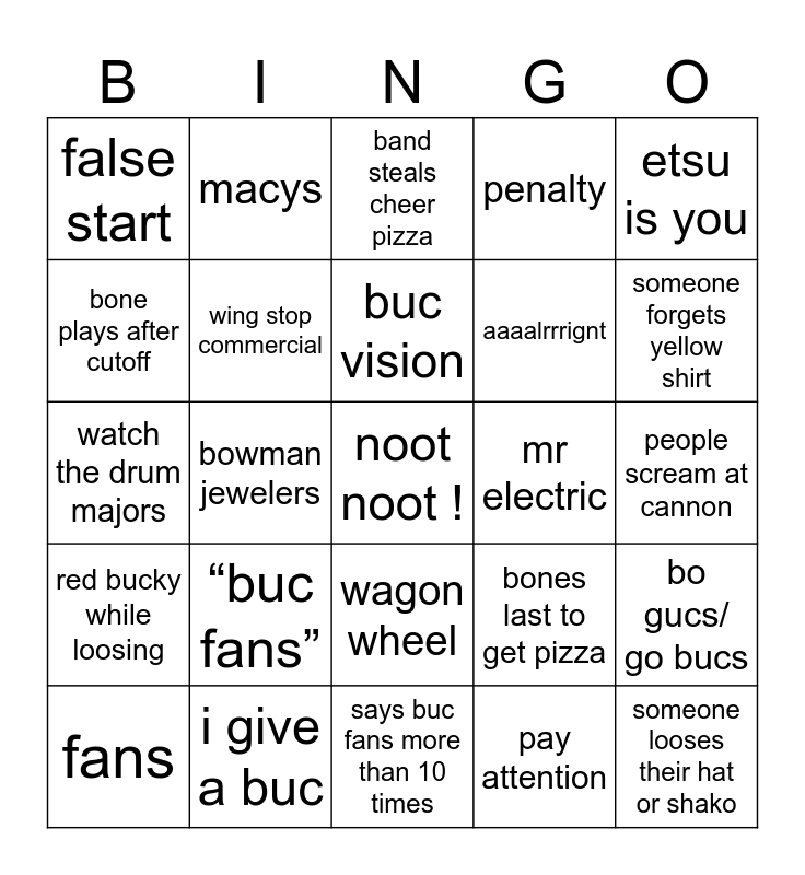 This bingo card has a free space and 24 words: “buc fans”, i give a buc, buc vision, fans, etsu is you, false start, bone plays after cutoff, macys, mr electric, wagon wheel, aaaalrrrignt, watch the drum majors, bones last to get pizza, bo gucs/ go bucs, wing stop commercial, pay attention, people scream at cannon, band steals cheer pizza, someone forgets yellow shirt, bowman jewelers, someone looses their hat or shako, red bucky while loosing, penalty and says buc fans more than 10 times.