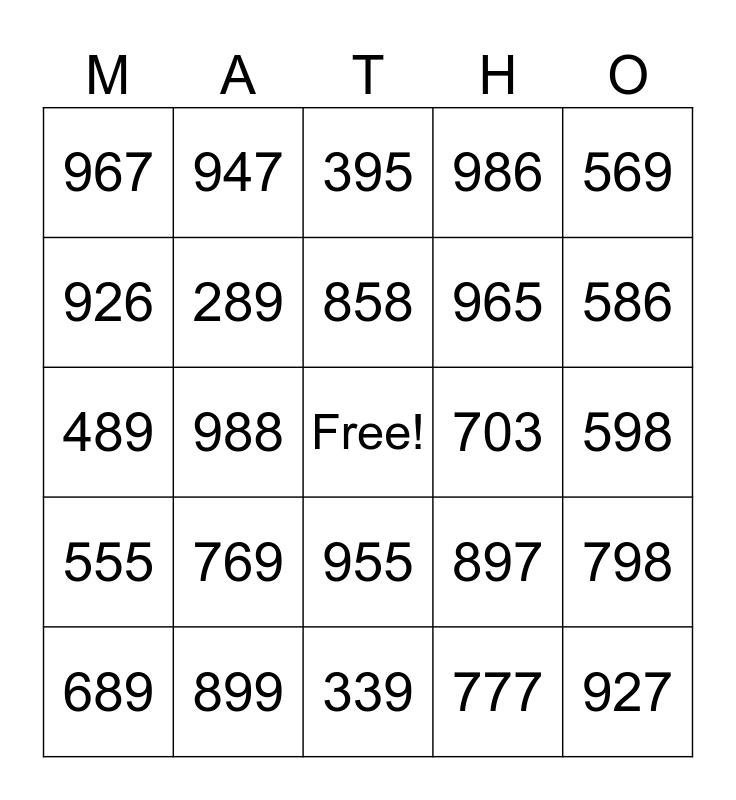This bingo card has a free space and 24 words: 769, 899, 858, 689, 569, 967, 926, 947, 703, 955, 965, 489, 897, 798, 289, 777, 598, 395, 586, 988, 927, 555, 986 and 339.