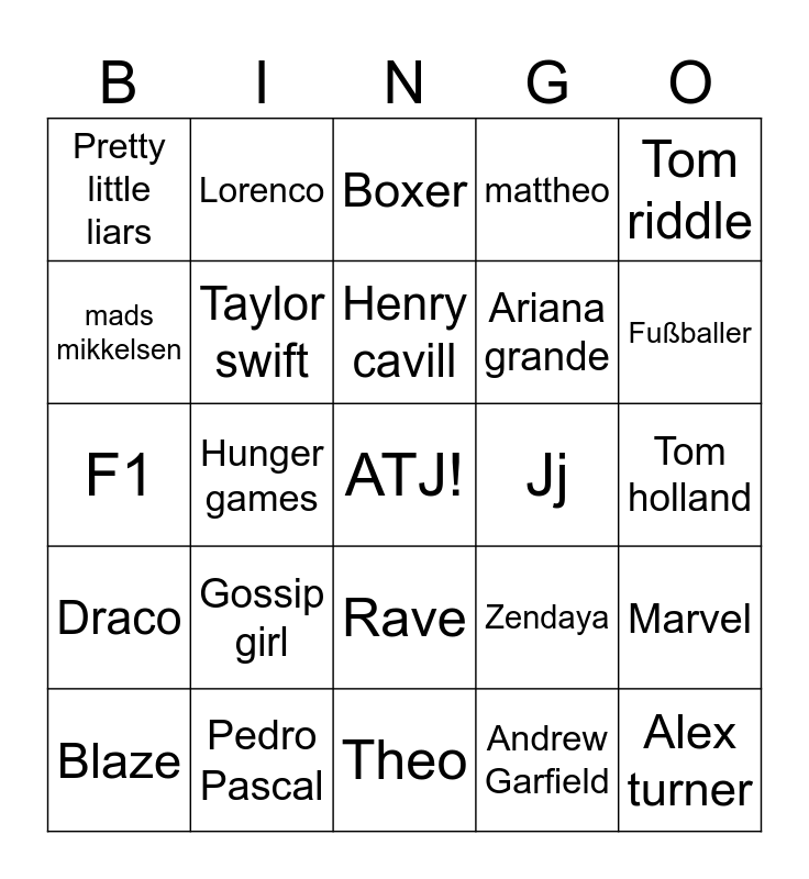 This bingo card has a free space and 24 words: Gossip girl, Pedro Pascal, Henry cavill, Blaze, Tom riddle, Pretty little liars, mads mikkelsen, Lorenco, Jj, Rave, Ariana grande, F1, Zendaya, Marvel, Taylor swift, Andrew Garfield, Tom holland, Boxer, Fußballer, Hunger games, Alex turner, Draco, mattheo and Theo.