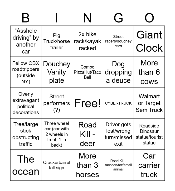 This bingo card has a free space and 26 words: Road Kill - deer, Road Kill - raccoon/fox/small animal, Combo PizzaHut/Taco Bell, Crackerbarrel tall sign, Giant Clock, “Asshole driving” by another car, Fellow OBX roadtrippers (outside NY), Pig Truck/horse trailer, Walmart or Target SemiTruck, Driver gets lost/wrong turn/missed exit, Dog dropping a deuce, Overly extravagant political decorations, Roadside Dinosaur statue/tourist statue, The ocean, Street performers (?), Car with too many bumper stickers (more than 15), Street racers/douchey cars, Tree/large stick obstructing traffic, 2x bike rack/kayak racked, Car carrier truck, More than 6 cows, More than 3 horses, CYBERTRUCK, Three wheel car (car with 2 wheels in front, 1 in back), Douchey Vanity plate and Stuck at 3 red lights in a row.