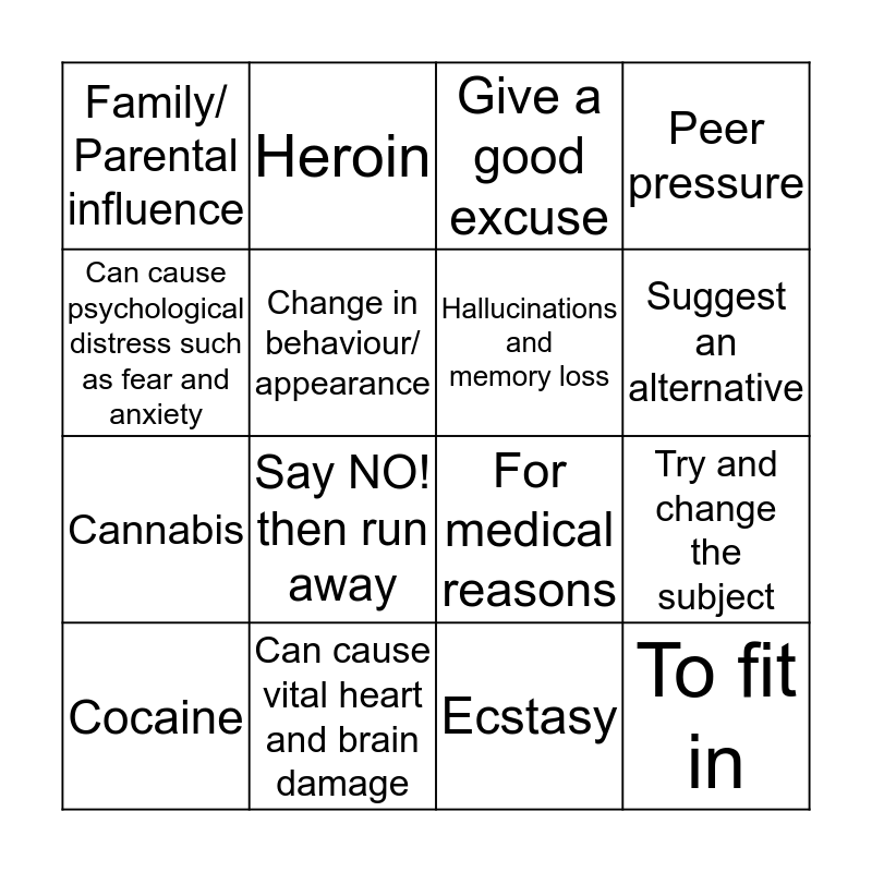 This bingo card has a free space and 15 words: Cocaine, To fit in, Give a good excuse, Family/ Parental influence, Suggest an alternative, Can cause psychological distress such as fear and anxiety, Say NO! then run away, Ecstasy, Change in behaviour/ appearance, Cannabis, Try and change the subject, Peer pressure, Hallucinations and memory loss, Heroin and Can cause vital heart and brain damage.
