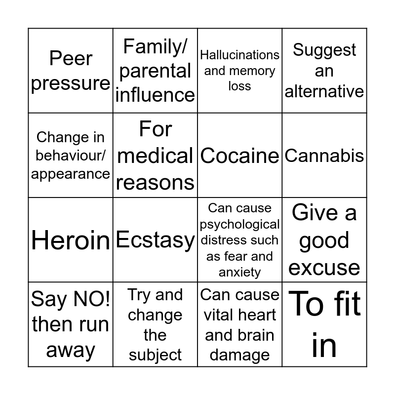 This bingo card has a free space and 15 words: Say NO! then run away, To fit in, Hallucinations and memory loss, Peer pressure, Cannabis, Change in behaviour/ appearance, Ecstasy, Can cause vital heart and brain damage, For medical reasons, Heroin, Give a good excuse, Suggest an alternative, Cocaine, Family/ parental influence and Try and change the subject.