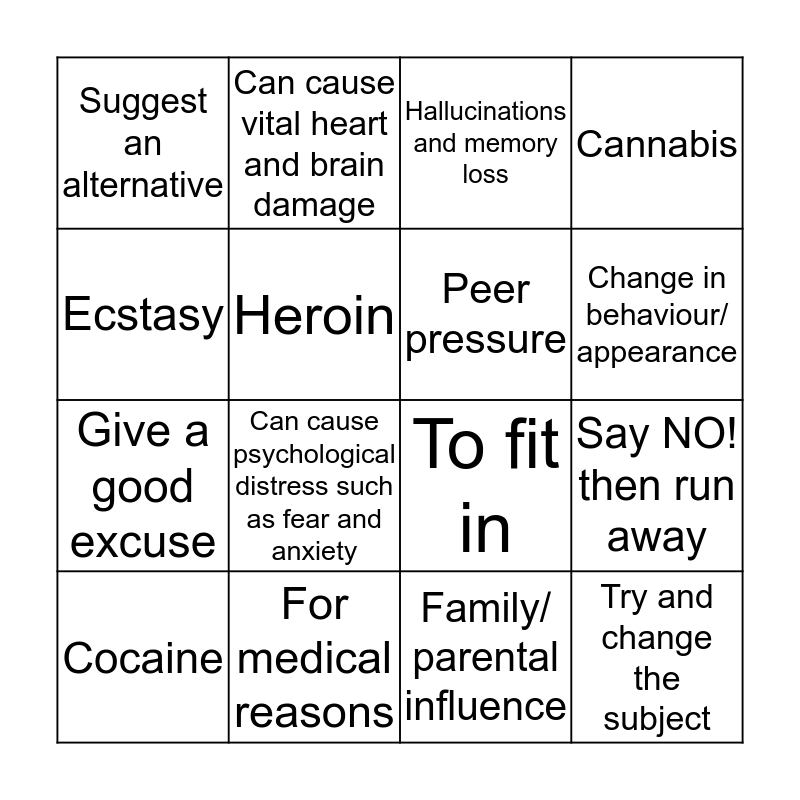 This bingo card has a free space and 15 words: Cocaine, Try and change the subject, Hallucinations and memory loss, Suggest an alternative, Change in behaviour/ appearance, Ecstasy, Can cause psychological distress such as fear and anxiety, Family/ parental influence, Heroin, Give a good excuse, Say NO! then run away, Cannabis, Peer pressure, Can cause vital heart and brain damage and For medical reasons.