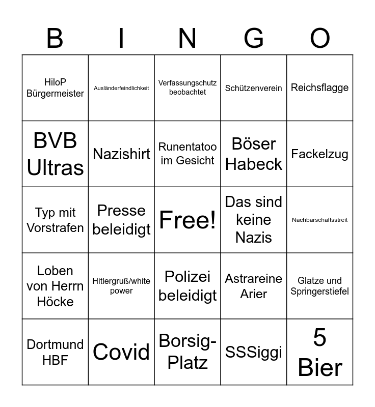 This bingo card has a free space and 24 words: Hitlergruß/white power, Covid, Runentatoo im Gesicht, Dortmund HBF, Reichsflagge, HiloP Bürgermeister, BVB Ultras, Ausländerfeindlichkeit, Das sind keine Nazis, Polizei beleidigt, Böser Habeck, Typ mit Vorstrafen, Astrareine Arier, Glatze und Springerstiefel, Nazishirt, SSSiggi, Nachbarschaftsstreit, Verfassungschutz beobachtet, Fackelzug, Presse beleidigt, 5 Bier, Loben von Herrn Höcke, Schützenverein and Borsig-Platz.