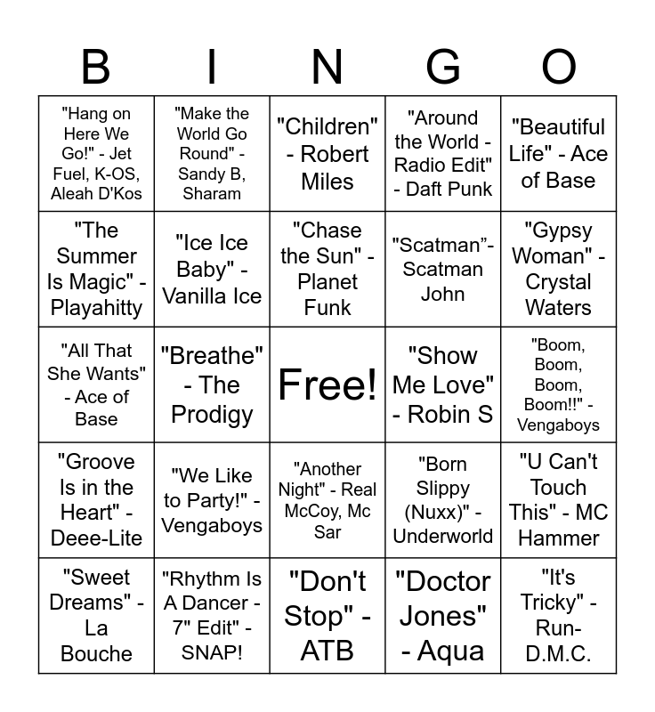 This bingo card has a free space and 40 words: "Better Off Alone" - Alice Deejay, "All That She Wants" - Ace of Base, "This Is Your Night" - Amber, "Ice Ice Baby" - Vanilla Ice, "Rhythm Is A Dancer - 7" Edit" - SNAP!, "Another Night" - Real McCoy, Mc Sar, "Chase the Sun" - Planet Funk, "Kernkraft 400" - Zombie Nation, "Beautiful Life" - Ace of Base, "Groove Is in the Heart" - Deee-Lite, "Breathe" - The Prodigy, "Around the World - Radio Edit" - Daft Punk, "It's Tricky" - Run-D.M.C., "Boom, Boom, Boom, Boom!!" - Vengaboys, "Show Me Love" - Robin S, "We Like to Party!" - Vengaboys, "I Wish - Radio Edit" - Skee-Lo, "Hang on Here We Go!" - Jet Fuel, K-OS, Aleah D'Kos, "Jump" - Kris Kross, "Children" - Robert Miles, "U Can't Touch This" - MC Hammer, "Doctor Jones" - Aqua, "Scatman”- Scatman John, "The Summer Is Magic" - Playahitty, "It's My Life" - Dr. Alban, "Sing It Back" - Moloko, "Believe" - Cher, "Sing Hallelujah!" - Dr. Alban, "Mambo No. 5" - Lou Bega, "On a Night Like This" - Kylie Minogue, "Let's Get Loud" - Jennifer Lopez, "Sweet Dreams" - La Bouche, "Dreamer" - Livin' Joy, "Born Slippy (Nuxx)" - Underworld, "Gypsy Woman" - Crystal Waters, "Don't Stop" - ATB, "Ooh Aah (Just A Little Bit) - Remastered" - Gina G, "Run Away" - Real McCoy, "Make the World Go Round" - Sandy B, Sharam and "Up (La, La, La)" - La Voix.