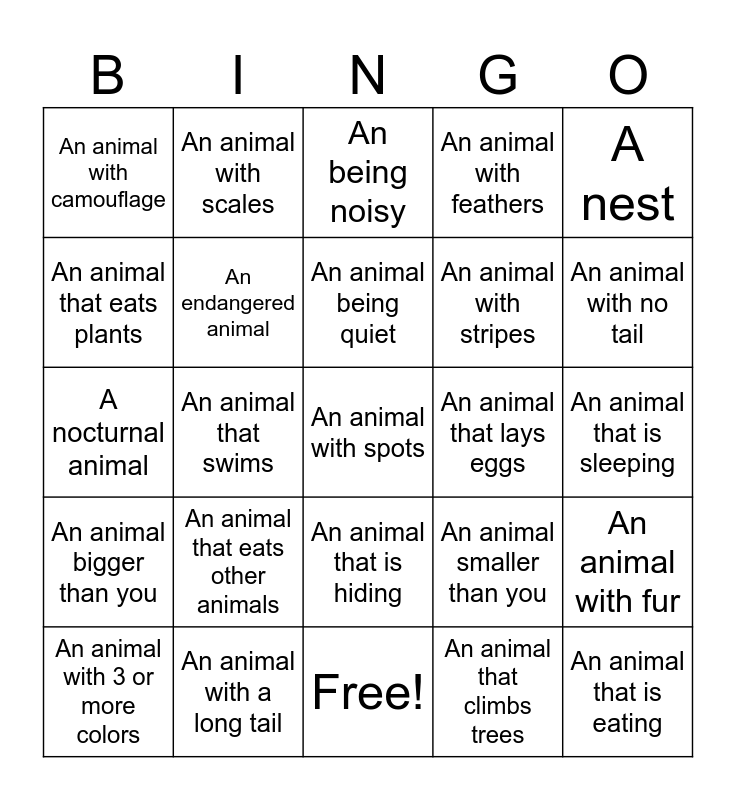 This bingo card has 25 words: An animal bigger than you, An animal with a long tail, An animal with spots, An animal that climbs trees, A nest, An animal with camouflage, An animal with scales, An being noisy, An animal that lays eggs, An animal with fur, An animal that eats plants, An endangered animal, Free!, An animal smaller than you, An animal with no tail, An animal with 3 or more colors, An animal that swims, An animal being quiet, An animal with stripes, An animal that is sleeping, A nocturnal animal, An animal that eats other animals, An animal that is hiding, An animal with feathers and An animal that is eating.