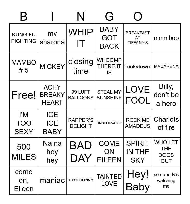 This bingo card has 36 words: COME ON EILEEN, BAD DAY, TAINTED LOVE, MAMBO # 5, I'M TOO SEXY, STEAL MY SUNSHINE, MICKEY, TUBTHUMPING, BREAKFAST AT TIFFANY'S, SPIRIT IN THE SKY, MACARENA, BABY GOT BACK, WHO LET THE DOGS OUT, ACHY BREAKY HEART, WHOOMP THERE IT IS, KUNG FU FIGHTING, 500 MILES, LOVE FOOL, Free!, WHIP IT, 99 LUFT BALLOONS, ICE ICE BABY, UNBELIEVABLE, RAPPER'S DELIGHT, ROCK ME AMADEUS, my sharona, funkytown, maniac, closing time, mmmbop, somebody's watching me, come on, Eileen, Chariots of fire, Billy, don't be a hero, Na na hey hey and Hey! Baby.