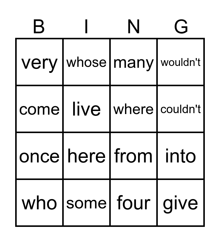 This bingo card has 20 words: into, were, many, any, who, come, some, very, once, whose, here, from, live, give, where, shouldn't, couldn't, wouldn't, four and been.