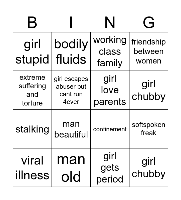 This bingo card has 17 words: girl gets period, viral illness, working class family, girl stupid, man beautiful, friendship between women, softspoken freak, girl love parents, girl chubby, girl escapes abuser but cant run 4ever, man old, confinement, extreme suffering and torture, bodily fluids, stalking, 70s anime references and girl chubby.