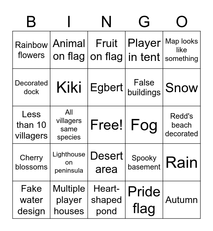 This bingo card has a free space and 27 words: Spooky basement, Villager graveyard, False buildings, Heart-shaped pond, Decorated dock, Fruit on flag, Animal on flag, Cherry blossoms, Fog, Rain, Less than 10 villagers, Player in tent, Fake water design, Multiple player houses, Snow, Carnival, Kiki, Egbert, Lighthouse on peninsula, Rainbow flowers, Redd's beach decorated, Pride flag, All villagers same species, Autumn, Desert area, Map looks like something and All villagers same color.