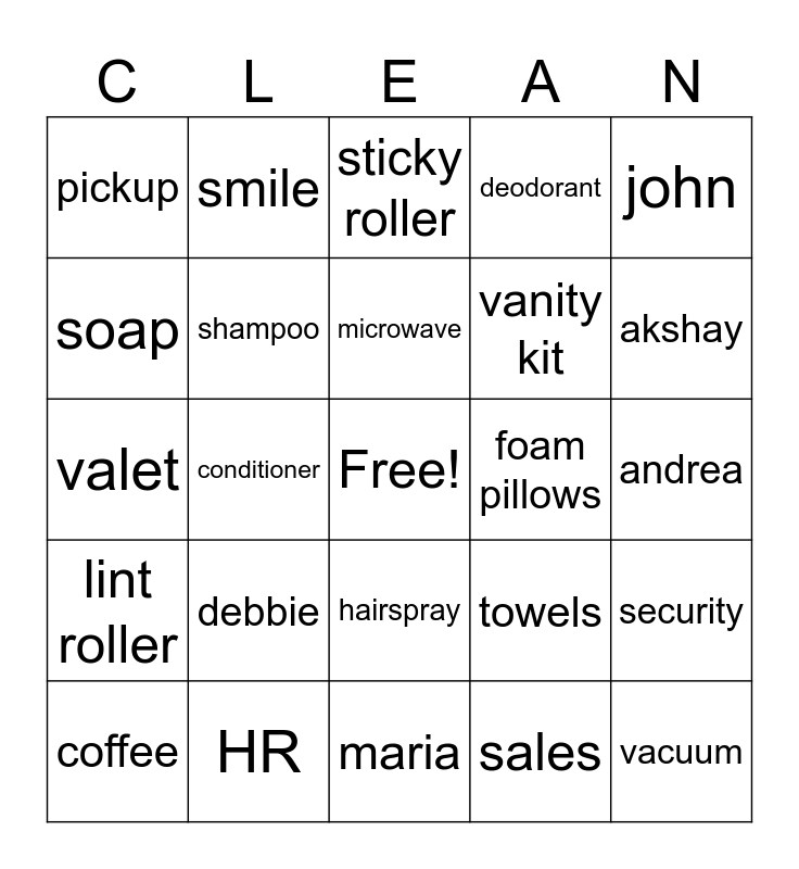 This bingo card has a free space and 39 words: rollaway, jonas, shave cream, shampoo, coffee, hairspray, microwave, mini fridge, john, lint roller, conditioner, deodorant, vacuum, andrea, foam pillows, debbie, razor, pickup, penthouse, towels, soap, maria, vanity kit, akshay, julie, kalvin, pickup, hotsos, blanket, smile, minibar, padraig, sticky roller, HR, sales, engineering, security, valet and dental kit.