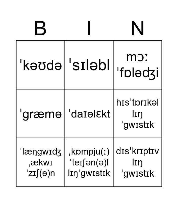 This bingo card has 43 words: ˈfəʊniːm, ˈmɔːfiːm, ˈsɪntæks, sɪˈmæntɪks, prægˈmætɪks, fəʊˈnɒləʤi, mɔːˈfɒləʤi, ˈlɛksɪkən, ˈdaɪəlɛkt, ˈæksənt, ˈgræmə, ˈkɒnsənənt, ˈvaʊəl, ˌɪntəʊˈneɪʃən, strɛs, təʊn, ɪnˈflɛkʃən, ˌdɛrɪˈveɪʃən, ˈsɪntæks triː, ˈæləˌfəʊn, ˈsɪləbl, ˈɒnsɛt, raɪm, ˈkəʊdə, ˈmɪnɪml peə, ˈhɒməʊfəʊn, ˈhɒməʊnɪm, ˈpɒlɪsi(ː)mi, ˈæntəʊnɪm, ˈsɪnənɪm, ˌɛtɪˈmɒləʤi, ˈləʊnwɜːd, kəʊd-ˈswɪʧɪŋ, baɪˈlɪŋgwəlɪz(ə)m, ˌmʌltɪˈlɪŋgwəlɪz(ə)m, əˈplaɪd lɪŋˈgwɪstɪk, ˈkɔːpəs lɪŋˈgwɪstɪk, ˌkɒmpju(ː)ˈteɪʃən(ə)l lɪŋˈgwɪstɪk, hɪsˈtɒrɪkəl lɪŋˈgwɪstɪk, dɪsˈkrɪptɪv lɪŋˈgwɪstɪk, prɪsˈkrɪptɪv lɪŋˈgwɪstɪks, ˈlæŋgwɪʤ ˌækwɪˈzɪʃ(ə)n and ˈlæŋgwɪʤ ˈfæmɪli.