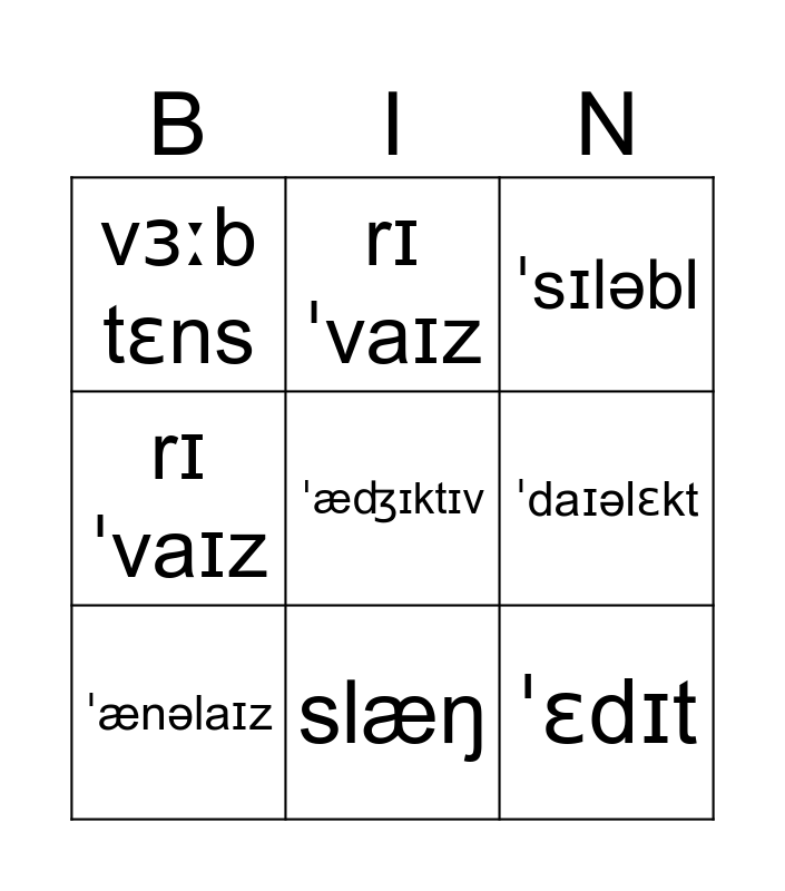 This bingo card has 96 words: naʊn, vɜːb, ˈæʤɪktɪv, ˈædvɜːb, ˈprəʊnaʊn, ˌprɛpəˈzɪʃən, kənˈʤʌŋkʃən, ˌɪntə(ː)ˈʤɛkʃən, ˈsɛntəns, ˈpærəgrɑːf, wɜːd, freɪz, klɔːz, ˈsɪləbl, ˈælfəbɪt, ˈdaɪəlɛkt, slæŋ, ˈʤɑːgən, ˈɪdɪəm, ˈmɛtəfə, ˈsɪmɪli, haɪˈpɜːbəli, əˌlɪtəˈreɪʃ(ə)n, raɪm, ˌɒnəʊmətəʊˈpi(ː)ə, ˈsɪŋgjʊlə, ˈplʊərəl, vɜːb tɛns, pɑːst tɛns, ˈprɛznt tɛns, ˈfjuːʧə tɛns, ˈæʤɪktɪv fɔːm, naʊn, vɜːb, ˈæʤɪktɪv, ˈædvɜːb, ˈprəʊnaʊn, ˌprɛpəˈzɪʃən, kənˈʤʌŋkʃən, ˌɪntə(ː)ˈʤɛkʃən, ˈsɛntəns, ˈpærəgrɑːf, wɜːd, freɪz, klɔːz, ˈsɪləbl, ˈælfəbɪt, ˈdaɪəlɛkt, slæŋ, ˈʤɑːgən, ˈɪdɪəm, ˈmɛtəfə, ˈsɪmɪli, haɪˈpɜːbəli, əˌlɪtəˈreɪʃ(ə)n, raɪm, ˌɒnəʊmətəʊˈpi(ː)ə, ˈsɪŋgjʊlə, ˈplʊərəl, vɜːb tɛns, pɑːst tɛns, ˈprɛznt tɛns, ˈfjuːʧə tɛns, ˈæʤɪktɪv fɔːm, ˈædvɜːb fɔːm, kəmˈpærətɪv, sju(ː)ˈpɜːlətɪv, riːd, raɪt, spiːk, ˈlɪsn, trænsˈleɪt, ɪnˈtɜːprɪt, ɪksˈpleɪn, dɪsˈkraɪb, dɪˈfaɪn, aɪˈdɛntɪfaɪ, ˈænəlaɪz, kri(ː)ˈeɪt, ˈɛdɪt, rɪˈvaɪz, riːd, raɪt, spiːk, ˈlɪsn, trænsˈleɪt, ɪnˈtɜːprɪt, ɪksˈpleɪn, dɪsˈkraɪb, dɪˈfaɪn, aɪˈdɛntɪfaɪ, ˈænəlaɪz, kri(ː)ˈeɪt, ˈɛdɪt, rɪˈvaɪz and kəˈmjuːnɪkeɪt.