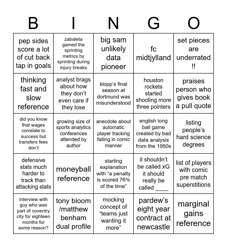 This bingo card has a free space and 24 words: moneyball reference, tony bloom /matthew benham dual profile, klopp’s final season at dortmund was misunderstood, interview with guy who was part of coventry city for eighteen months for some reason?, set pieces are underrated !!, pep sides score a lot of cut back tap in goals, thinking fast and slow reference, zabaleta gamed the sprinting metrics by sprinting during injury breaks, english long ball game created by bad data analysis from the 1950s, starting explanation with “a penalty is scored 76% of the time”, houston rockets started shooting more three pointers, did you know that wages correlate to success but transfers fees don’t, it shouldn’t be called xG it should really be called ____, list of players with comic pre match superstitions, analyst brags about how they don’t even care if they lose, pardew’s eight year contract at newcastle, listing people’s hard science degrees, big sam unlikely data pioneer, praises person who gives book a pull quote, growing size of sports analytics conferences attended by author, marginal gains reference, defensive stats much harder to track than attacking stats, fc midtjylland and mocking concept of “teams just wanting it more”.