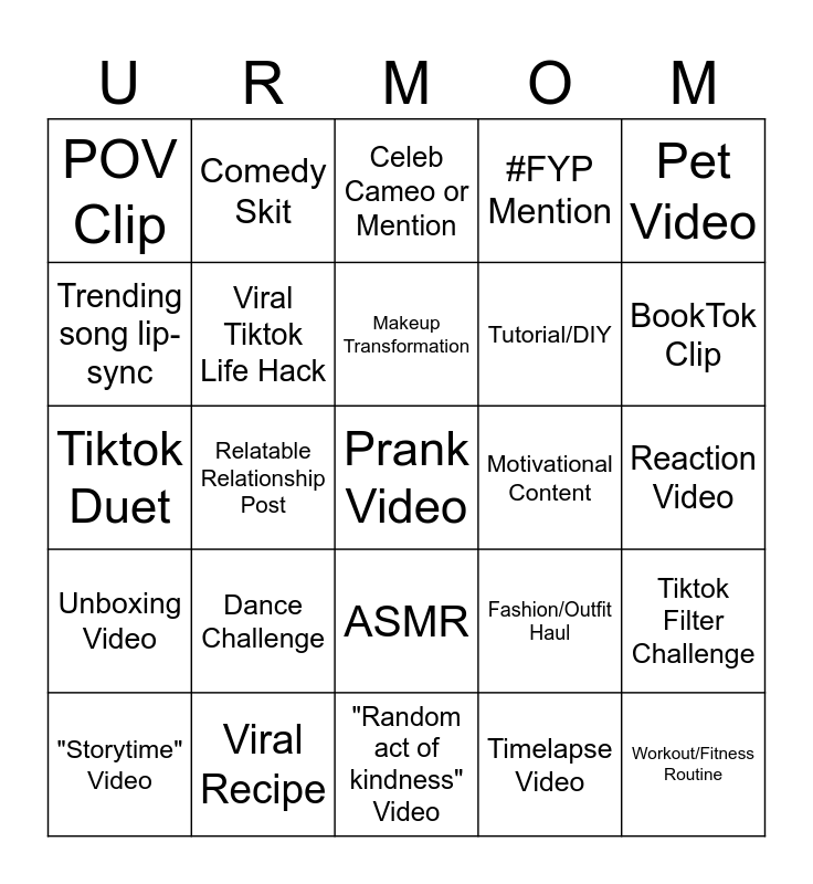 This bingo card has a free space and 24 words: Dance Challenge, Viral Recipe, Makeup Transformation, "Storytime" Video, Pet Video, POV Clip, Trending song lip-sync, Comedy Skit, Motivational Content, ASMR, Tutorial/DIY, Tiktok Duet, Fashion/Outfit Haul, Tiktok Filter Challenge, Viral Tiktok Life Hack, Timelapse Video, Reaction Video, Celeb Cameo or Mention, BookTok Clip, Relatable Relationship Post, Workout/Fitness Routine, Unboxing Video, #FYP Mention and "Random act of kindness" Video.