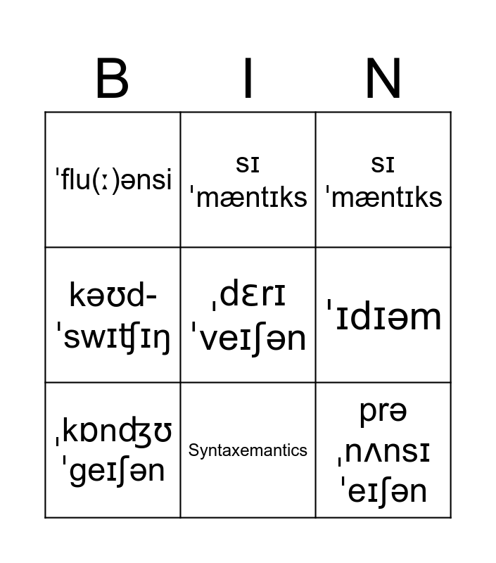 This bingo card has 82 words: ˈgræmə, ˈsɪntæks, sɪˈmæntɪks, fəʊˈnɛtɪks, ˈlɛksɪkən, mɔːˈfɒləʤi, ˈdaɪəlɛkt, prægˈmætɪks, fəʊˈnɒləʤi, vəʊˈkæbjʊləri, ˌɛtɪˈmɒləʤi, sɪˈmæntɪks, ˌkɒnʤʊˈgeɪʃən, ˈsɪntæks, ˈmɔːfɪŋ, ˈflu(ː)ənsi, ˈæksənt, ˈɪdɪəm, slæŋ, ˌpʌŋktjʊˈeɪʃən, sɪˈmæntɪks, prəˌnʌnsɪˈeɪʃən, ˈsɪntæks, ˌdɛrɪˈveɪʃən, ˈkɒgneɪts, ˈhɒməʊfəʊnz, ˈhɒməʊnɪmz, ˈsɪnənɪmz, ˈæntəʊnɪmz, trænsˈleɪʃən, lɪŋˈgwɪstɪks, ˈfəʊniːm, ɪnˈflɛkʃən, ɪˈlɪpsɪs, ˈləʊnwɜːd, ni(ː)ˈɒləʤɪzm, kəˈləʊkwɪəl, ˈrɛʤɪstə, baɪˈlɪŋgwəl, ˌmʌltɪˈlɪŋgwəl, ˈlæŋgwɪʤ ˈfæmɪli, kəʊd-ˈswɪʧɪŋ, ˈʤɑːgən, dɪsˈkɔːs, ˈrɛtərɪk, sɪˈmæntɪks, Grapheme, Syntaxemantics, ˌkɒnʤʊˈgeɪʃən, ˈsɪntæks, ˈmɔːfɪŋ, ˈflu(ː)ənsi, ˈæksənt, ˈɪdɪəm, slæŋ, ˌpʌŋktjʊˈeɪʃən, sɪˈmæntɪks, prəˌnʌnsɪˈeɪʃən, ˈsɪntæks, ˌdɛrɪˈveɪʃən, ˈkɒgneɪts, ˈhɒməʊfəʊnz, ˈhɒməʊnɪmz, ˈsɪnənɪmz, ˈæntəʊnɪmz, trænsˈleɪʃən, lɪŋˈgwɪstɪks, ˈfəʊniːm, ɪnˈflɛkʃən, ɪˈlɪpsɪs, ˈləʊnwɜːd, ni(ː)ˈɒləʤɪzm, kəˈləʊkwɪəl, ˈrɛʤɪstə, baɪˈlɪŋgwəl, ˌmʌltɪˈlɪŋgwəl, ˈlæŋgwɪʤ ˈfæmɪli, kəʊd-ˈswɪʧɪŋ, ˈʤɑːgən, dɪsˈkɔːs, ˈrɛtərɪk and sɪˈmæntɪks.