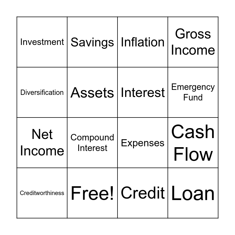 This bingo card has 21 words: Free!, Budget, Savings, Debt, Credit, Interest, Investment, Inflation, Expenses, Emergency Fund, Net Income, Gross Income, Loan, Deficit, Assets, Liabilities, Creditworthiness, Compound Interest, Diversification, Cash Flow and Bartering.