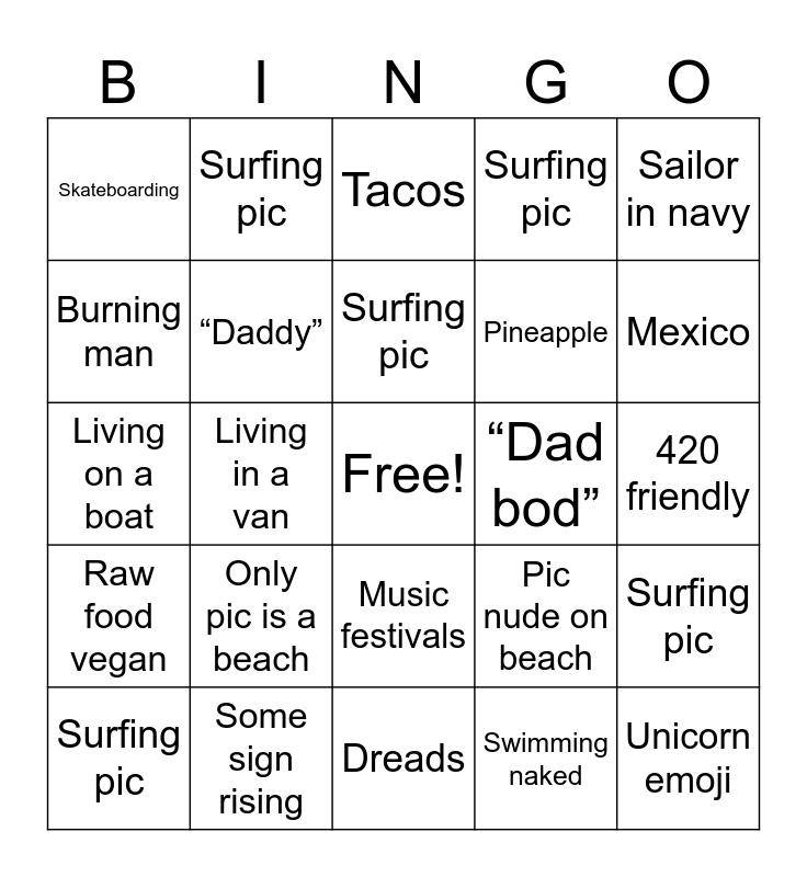 This bingo card has a free space and 29 words: Surfing pic, Just out of relationship, Living in a van, Smoothies, Skateboarding, Tacos, “Daddy”, Only pic is a beach, “Dad bod”, Some sign rising, 420 friendly, Unicorn emoji, Dreads, Swimming naked, Mexico, “In a loving stable relationship”, Music festivals, Raw food vegan, Sailor in navy, Living on a boat, Pic nude on beach, Smoking weed in pic, Pineapple, Burning man, Surfing pic, Surfing pic, Surfing pic, Surfing pic and Surfing pic.
