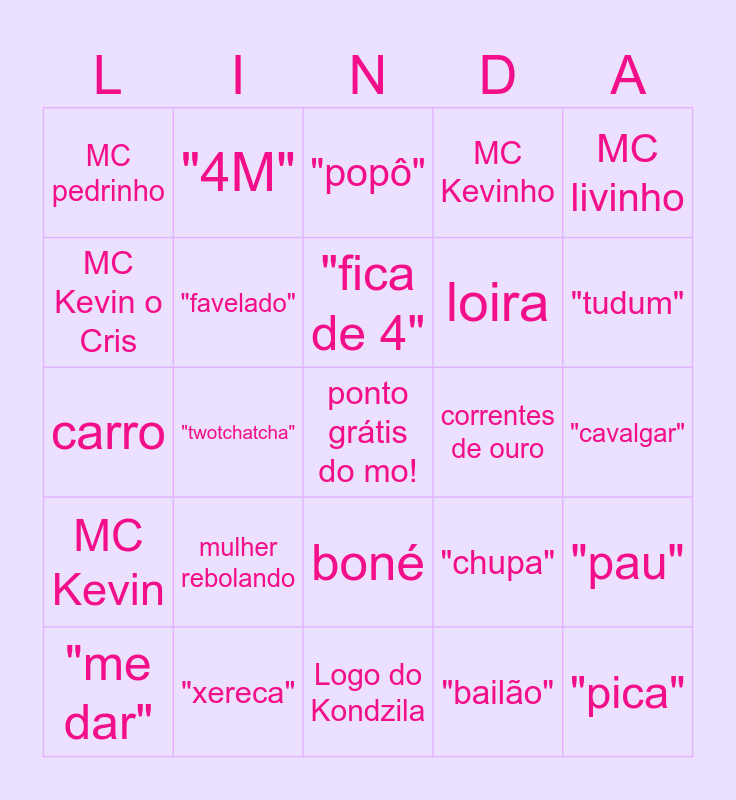 This bingo card has a free space and 24 words: mulher rebolando, "xereca", "fica de 4", "me dar", MC livinho, MC pedrinho, MC Kevin o Cris, "4M", correntes de ouro, boné, loira, carro, "chupa", "pau", "favelado", "bailão", "cavalgar", "popô", "tudum", "twotchatcha", "pica", MC Kevin, MC Kevinho and Logo do Kondzila.