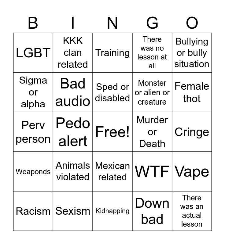 This bingo card has a free space and 24 words: Animals violated, Sexism, Sped or disabled, Racism, Bullying or bully situation, LGBT, Sigma or alpha, KKK clan related, Murder or Death, Mexican related, Monster or alien or creature, Perv person, WTF, Vape, Bad audio, Down bad, Cringe, Training, Female thot, Pedo alert, There was an actual lesson, Weaponds, There was no lesson at all and Kidnapping.