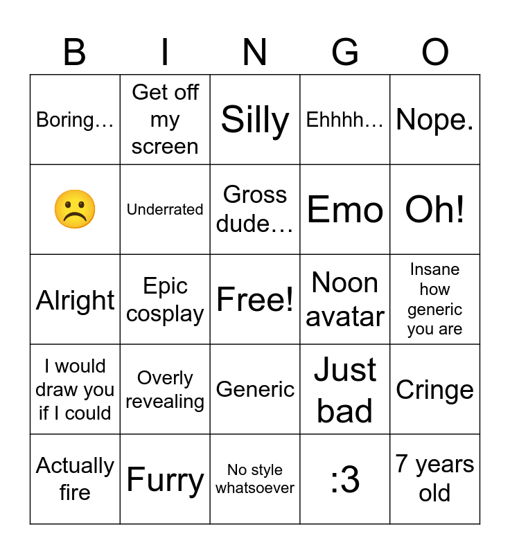 This bingo card has a free space and 24 words: Overly revealing, Furry, Gross dude…, Actually fire, Nope., Boring…, ☹️, Get off my screen, Noon avatar, Generic, Emo, Alright, Just bad, Cringe, Underrated, :3, Insane how generic you are, Silly, Oh!, Epic cosplay, 7 years old, I would draw you if I could, Ehhhh… and No style whatsoever.