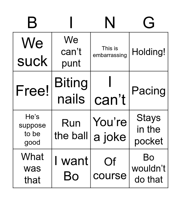 This bingo card has 16 words: I want Bo, Stays in the pocket, This is embarrassing, We suck, He’s suppose to be good, We can’t punt, You’re a joke, Of course, Free!, Biting nails, What was that, Holding!, Run the ball, Pacing, I can’t and Bo wouldn’t do that.
