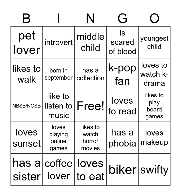 This bingo card has a free space and 24 words: loves playing online games, coffee lover, has a collection, has a sister, youngest child, pet lover, likes to walk, introvert, loves to read, likes to watch horror movies, k-pop fan, NBSB/NGSB, has a phobia, loves makeup, born in september, biker, likes to play board games, middle child, loves to watch k-drama, like to listen to music, swifty, loves sunset, is scared of blood and loves to eat.