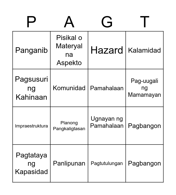 This bingo card has 16 words: Pagtataya ng Kapasidad, Panlipunan, Hazard, Kalamidad, Pagsusuri ng Kahinaan, Pisikal o Materyal na Aspekto, Ugnayan ng Pamahalaan, Pagbangon, Panganib, Komunidad, Pagtutulungan, Pag-uugali ng Mamamayan, Impraestruktura, Planong Pangkaligtasan, Pamahalaan and Pagbangon.
