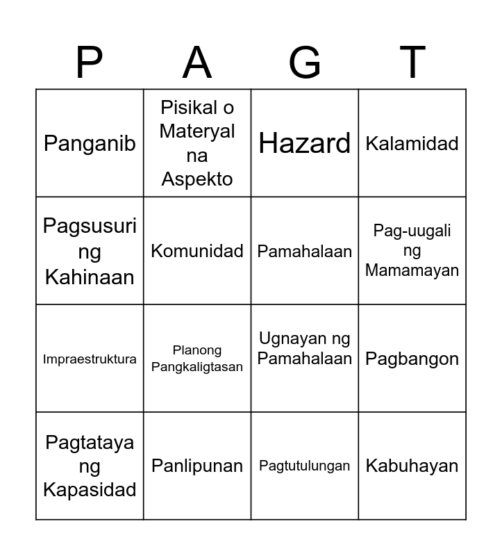 This bingo card has 16 words: Pagtataya ng Kapasidad, Panlipunan, Hazard, Kalamidad, Pagsusuri ng Kahinaan, Pisikal o Materyal na Aspekto, Ugnayan ng Pamahalaan, Pagbangon, Panganib, Komunidad, Pagtutulungan, Pag-uugali ng Mamamayan, Impraestruktura, Planong Pangkaligtasan, Pamahalaan and Kabuhayan.