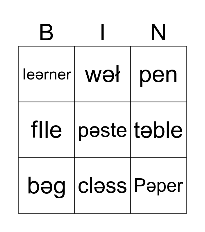 This bingo card has a free space and 8 words: təble, pen, wəł, bəg, Ieərner, Pəper, fIle and cləss.